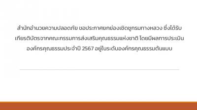 สำนักอำนวยความปลอดภัย ขอประกาศยกย่องเชิดชูกรมทางหลวง ซึ่งได้รับเกียรติบัตรจากคณะกรรมการส่งเสริมคุณธรรมแห่งชาติ