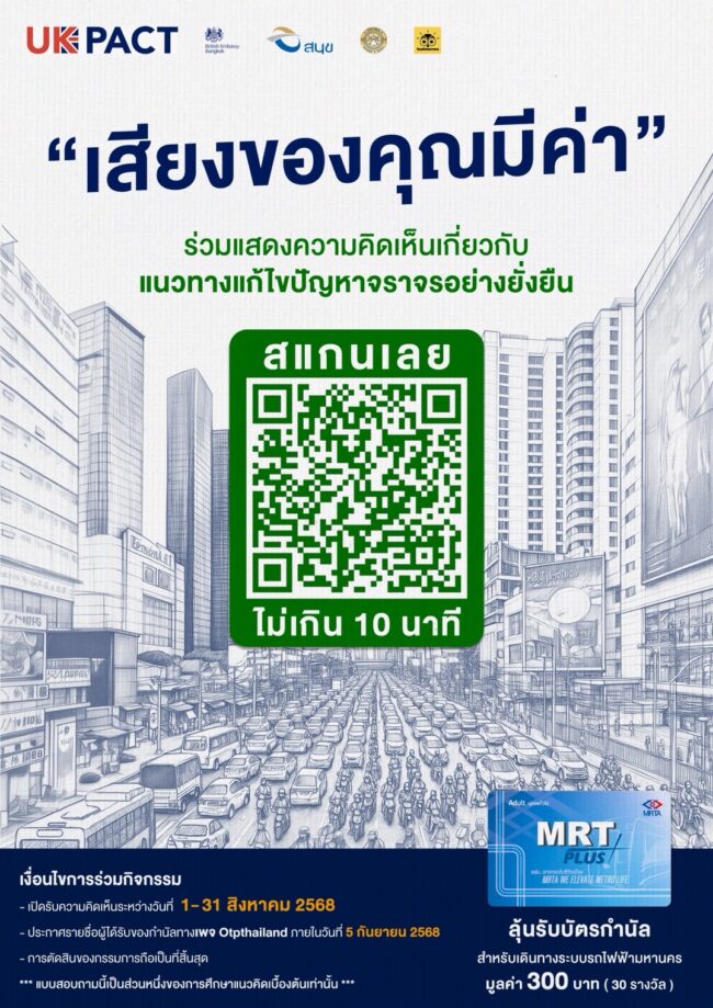 สนข. ขอเชิญชวนประชาชนทุกท่านร่วมแสดงความคิดเห็นเกี่ยวกับ “แนวทางการแก้ไขปัญหาจราจรอย่างยั่งยืน” 📲 แสกน QR Code ตอบคำถามเลย ❗️ใช้เวลาตอบไม่เกิน 10 นาที เท่านั้น 🎁 ลุ้นรับบัตรกำนัลสำหรับเดินทางระบบรถไฟฟ้ามหานคร มูลค่า 300 บาท (30 รางวัล) 🚝 🕔ร่วมแสดงความคิดเห็นได้ตั้งแต่วันที่ 1 – 31 สิงหาคม 2568 🎉ประกาศรายชื่อผู้ที่ได้รับของกำนัลทางเพจ Otpthailand 🗯️ การตัดสินของกรรมการถือเป็นที่สิ้นสุด 🔴 แบบสอบถามนี้เป็นส่วนหนึ่งของการศึกษาแนวคิดเบื้องต้นเท่านั้น